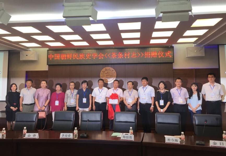 借助此次会议,18日中午,中国朝鲜民族史学会还举行了《吉林省安图县石门镇茶条村志》赠书仪式。茶条村是一个民族与生态、物质与文化、现代与传统相结合的朝鲜族特色村寨,于2014年5月被列入“首批中国少数民族特色村寨名录”;《茶条村志》是中国朝鲜民族史学会推动的第一部乡村志,由朴今海、郑喜淑、金学锦主编。